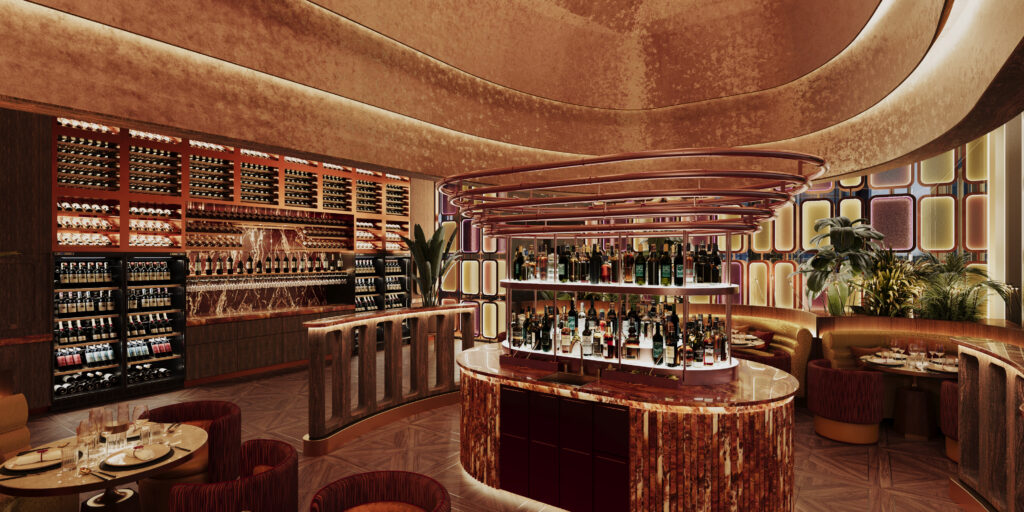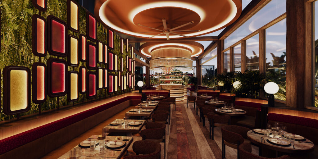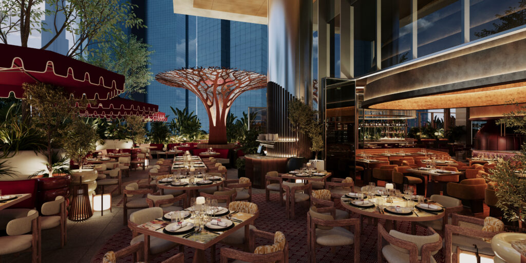 Duck & Waffle Dubai stuns with a bold, artful interior that blends urban edge with refined elegance. A glowing dome ceiling and sculptural metal tree centerpiece frame views of the Burj Khalifa, while floor-to-ceiling windows flood the space with natural light. The open kitchen and 360° chef’s bar add vibrant energy, while warm gold tones, lush greenery, and ambient lighting create a chic, inviting atmosphere. High ceilings and a greenhouse-inspired pergola lend a sense of airiness.
