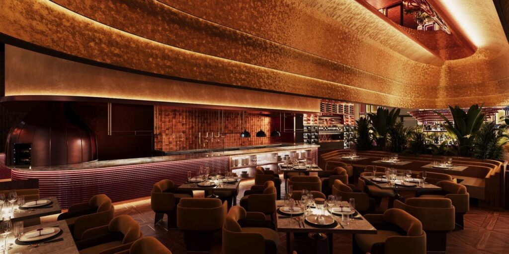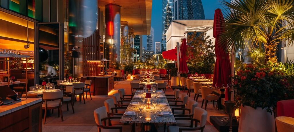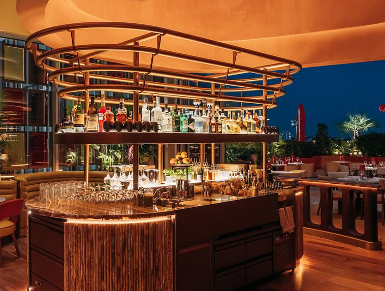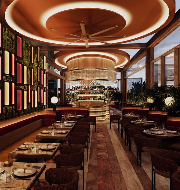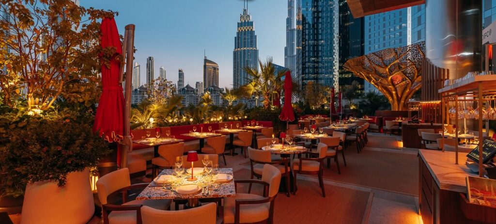 Duck & Waffle Dubai stuns with a bold, artful interior that blends urban edge with refined elegance. A glowing dome ceiling and sculptural metal tree centerpiece frame views of the Burj Khalifa, while floor-to-ceiling windows flood the space with natural light. The open kitchen and 360° chef’s bar add vibrant energy, while warm gold tones, lush greenery, and ambient lighting create a chic, inviting atmosphere. High ceilings and a greenhouse-inspired pergola lend a sense of airiness.