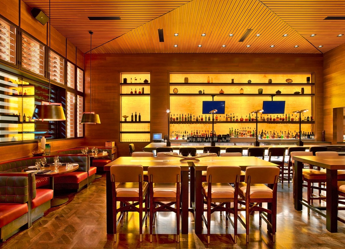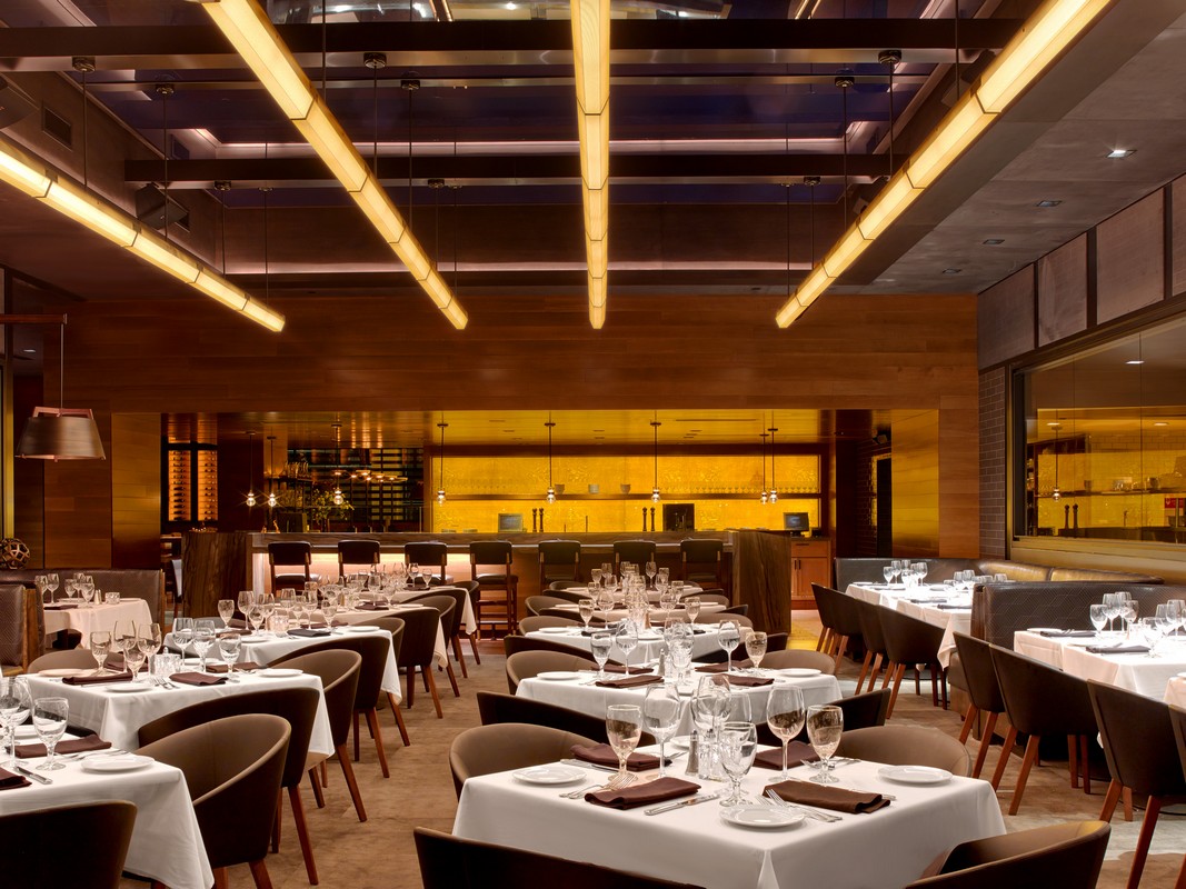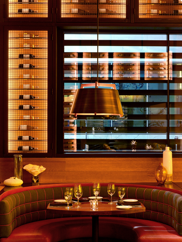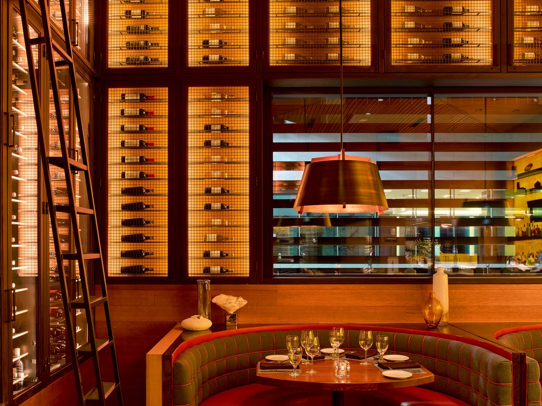 The design won a top award for illuminating engineering.The soaring main dining room immerses guests in a sultry space surrounded by inward-facing nooks, glowing wine walls, and a grand staircase up to the dining mezzanine.