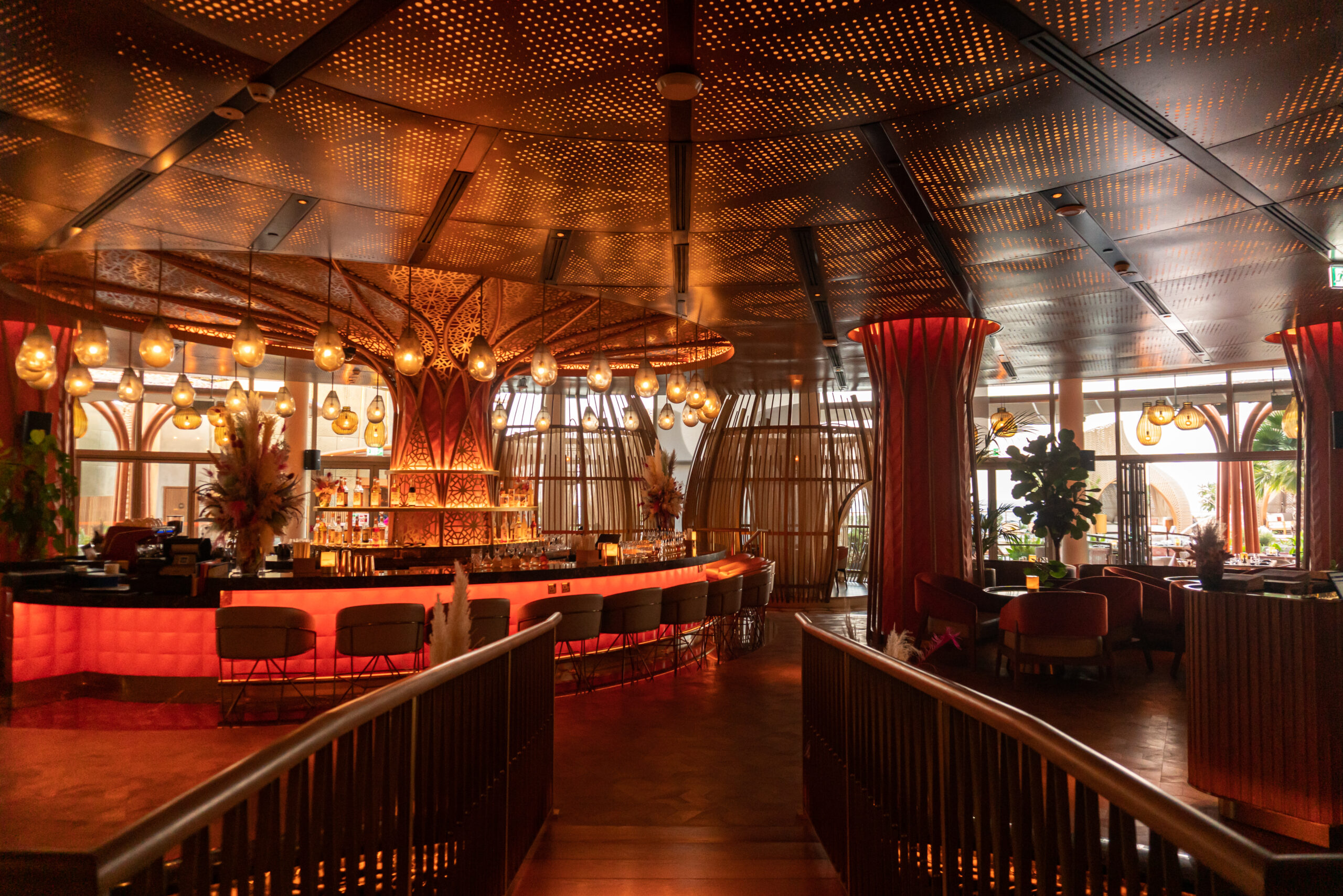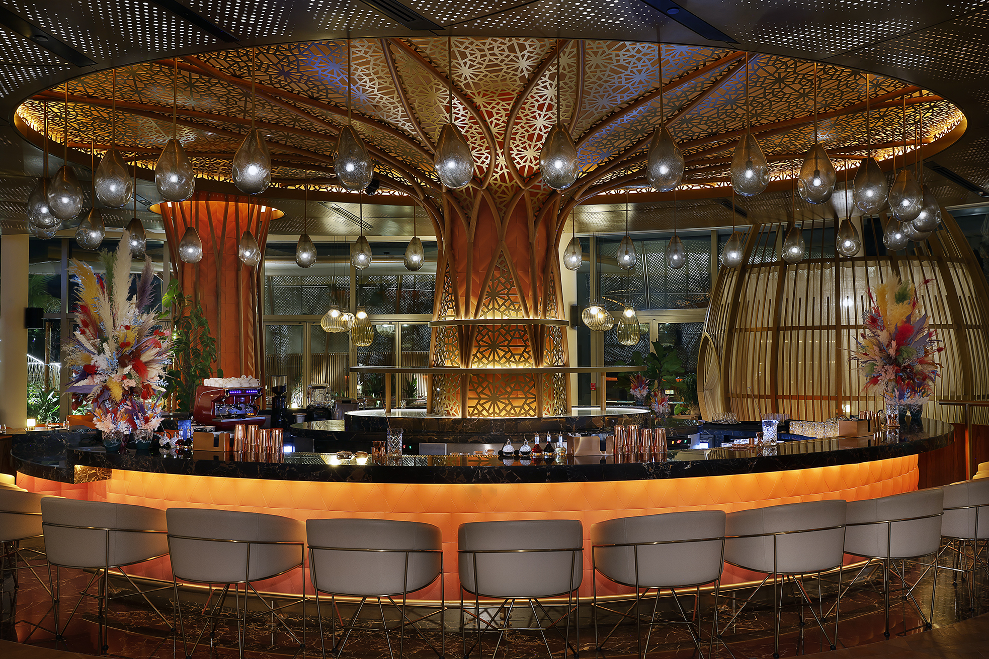 A sleek, high-energy setting perched in the Waldorf Astoria Lusail, Sushi Samba features floor-to-ceiling windows with panoramic sea views, bold geometric patterns, ambient lighting, and a striking tree-like centerpiece that anchors the space. Service is polished and attentive, enhancing the upscale yet lively atmosphere. SUSHISAMBA Doha is a feast for the senses—perfect for a memorable night out or a chic celebration.